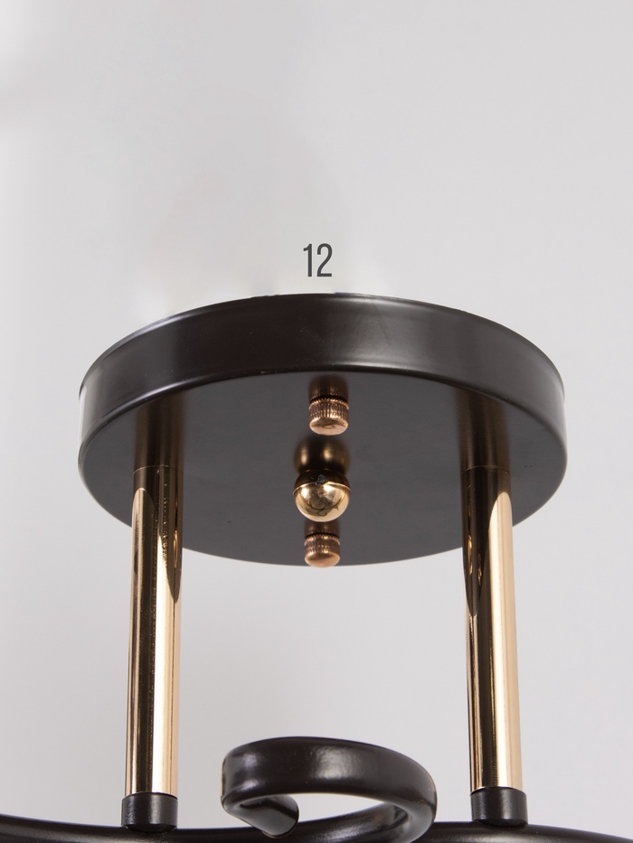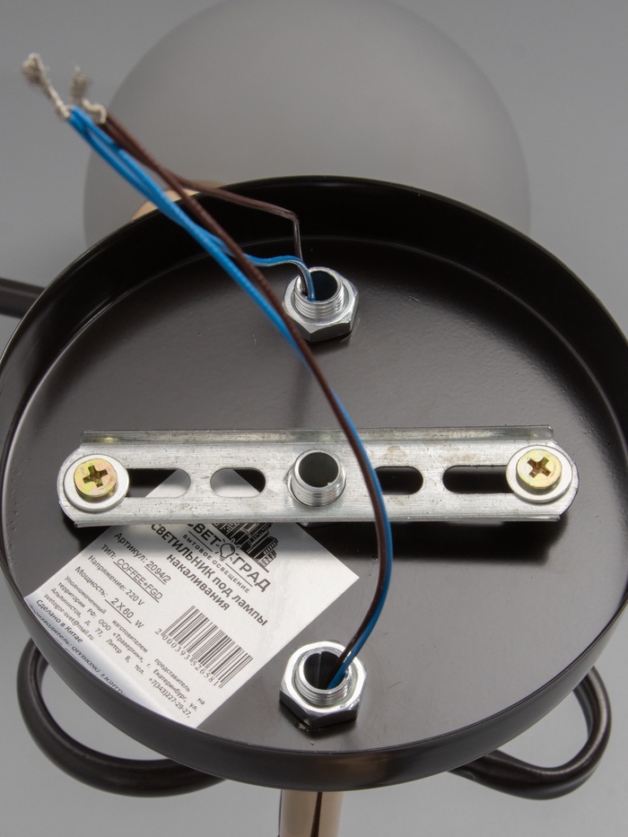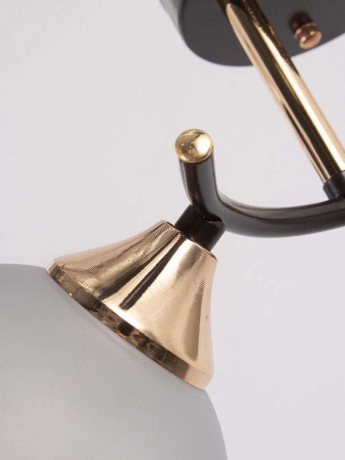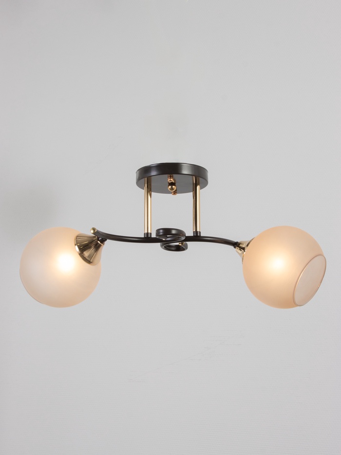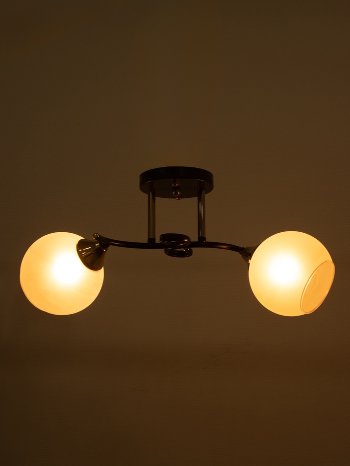 Свет с оттенком роскоши. Потолочная люстра с двумя плафонами в стиле арт-деко — изысканное решение для спальни, гостиной или просторного коридора до 12 м². Кофейно-золотистое металлическое основание создаёт тёплый контраст с белыми полусферическими плафонами, а компактные габариты (45×18×24 см) позволяют разместить её даже в помещениях со средней высотой потолков. Лампы не входят в комплект — подойдут любые с цоколем E27 до 60 Вт: накаливания, филаментные или энергосберегающие.