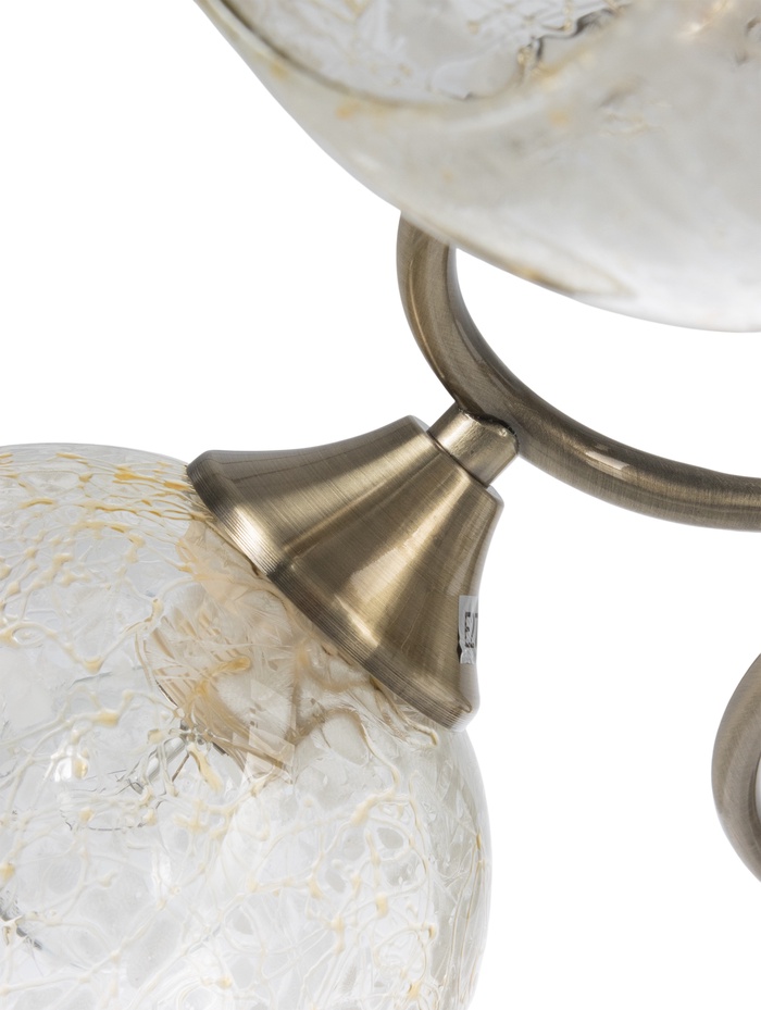 Потолочная люстра с бронзовым металлическим корпусом и пятью шарообразными стеклянными плафонами создаёт стильное и гармоничное освещение в вашем интерьере. Элегантное сочетание блестящей бронзы и прозрачного стекла делает её замечательным центром композиции в гостиной, столовой или просторной кухне, а современный дизайн легко вписывается в разные стилистические решения, от классического до современного. Эта модель привносит теплоту и выразительность, делая помещение визуально более уютным и завершённым.