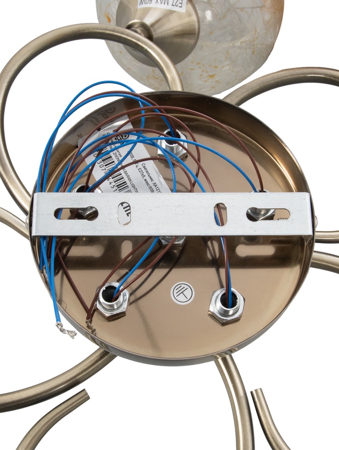 Люстра рассчитана на пять источников света с универсальным цоколем E27 и максимальной мощностью до 60 Вт каждая, что обеспечивает высокий световой поток около 4000 Лм — достаточно для эффективного освещения комнат площадью до 27 м². Потолочный монтаж на планку делает установку надёжной и удобной, а совместимость с натяжными потолками при использовании светодиодных ламп расширяет варианты размещения в интерьере.