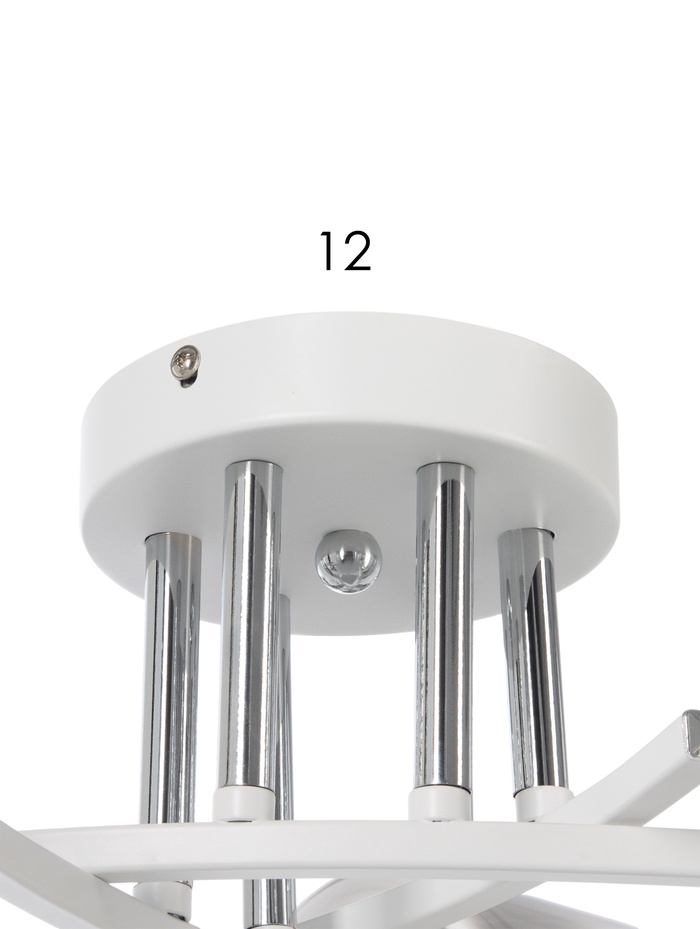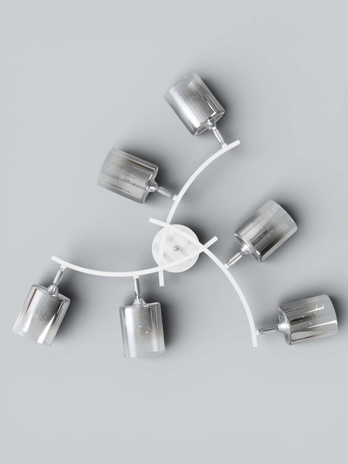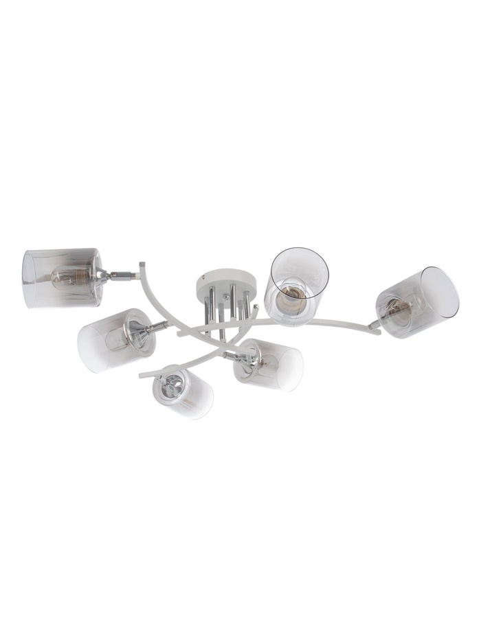 Потолочная люстра с шестью источниками света создаёт равномерное и комфортное освещение, подчёркивая современный характер интерьера. Белое металлическое основание и прозрачные стеклянные цилиндрические плафоны обеспечивают лёгкость конструкции и гармонично вписываются в просторные гостиные, кухни-столовые, студии или рабочие зоны. Модель рассчитана на освещение площади до 29 м² и подходит для стандартной высоты потолков благодаря конструкции без подвеса.