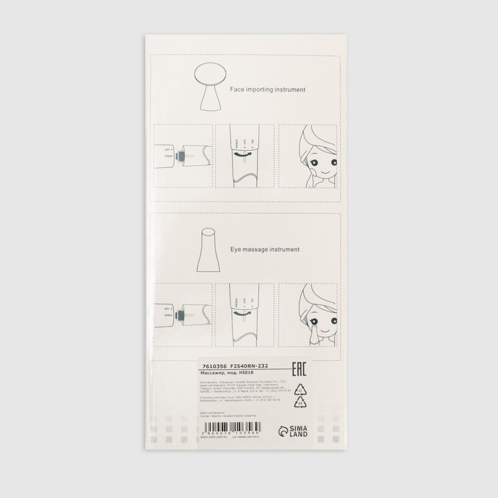 Вибромассажёр для лица придаёт коже тонус, разглаживает её, успокаивает, снимает следы стресса и воспалений. Он выполняет мягкий вибрационный массаж. Массажёр имеет две насадки: для лица и для области вокруг глаз.