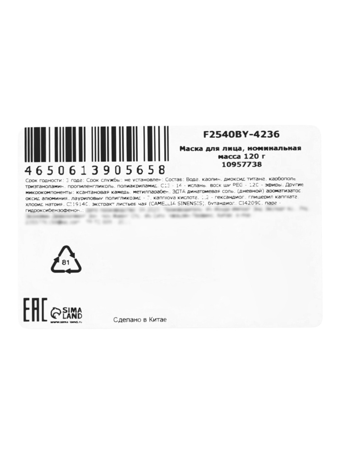 Технические характеристики Маска для лица грязевая, очищающая, с зеленым чаем, 120 г