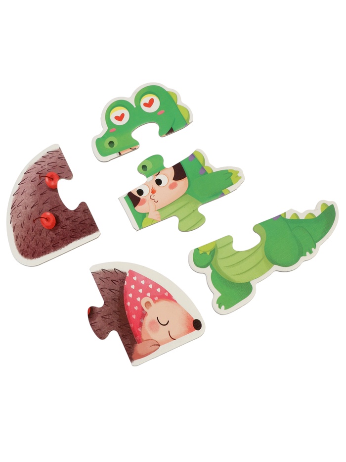Как играть? Играть с магнитным пазлом-набором «Animals» просто: сначала ребёнок подбирает детали и собирает из них целых зверят, а потом «заселяет» их на полянку в книге-сцене — ставит рядом, переставляет, придумывает, кто куда идёт и что происходит. Можно предложить ему угадать по одной детали, какому животному она принадлежит, или наоборот — дать готового зверя и попросить найти все его части.