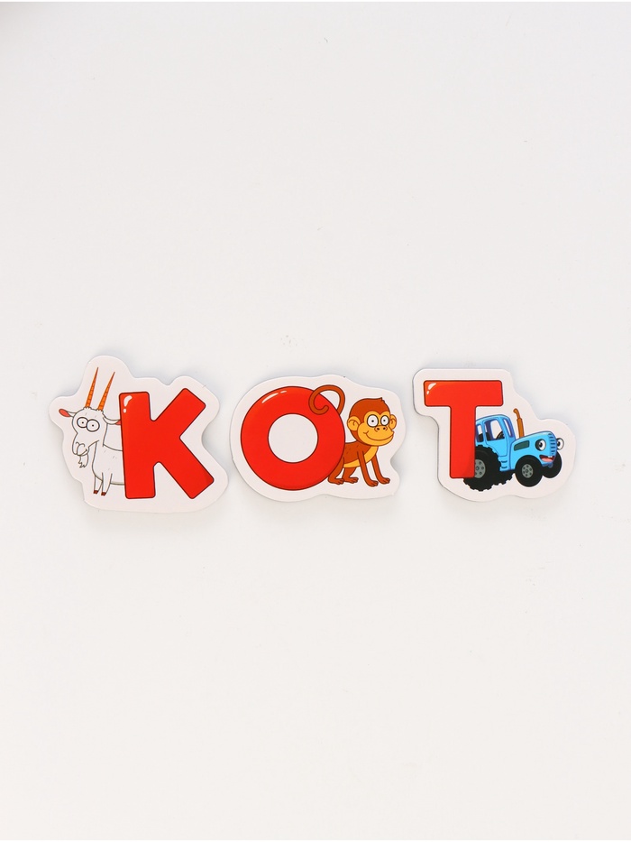 - 40 магнитных элементов: в комплект входят все буквы русского алфавита и дополнительные фигурки с персонажами. Каждый элемент сделан из лёгкого пенокартона с магнитным слоем.