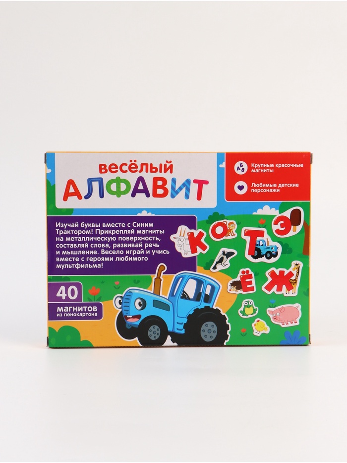 - Узнаваемые детские герои: буквы сопровождаются рисунками популярных мультяшных персонажей — синего трактора и его друзей. Это делает процесс обучения более привлекательным и понятным для детей.