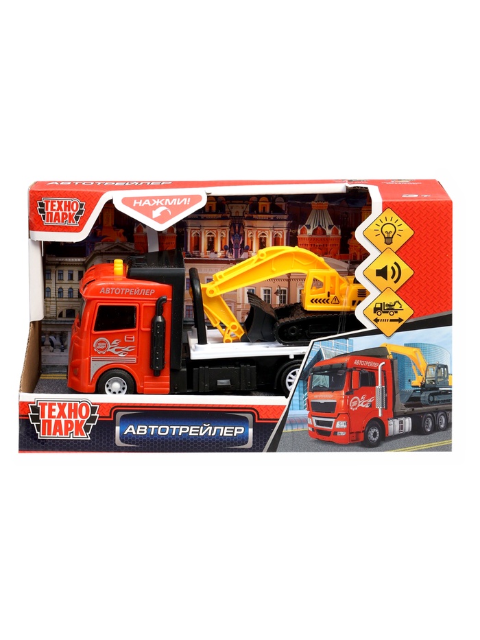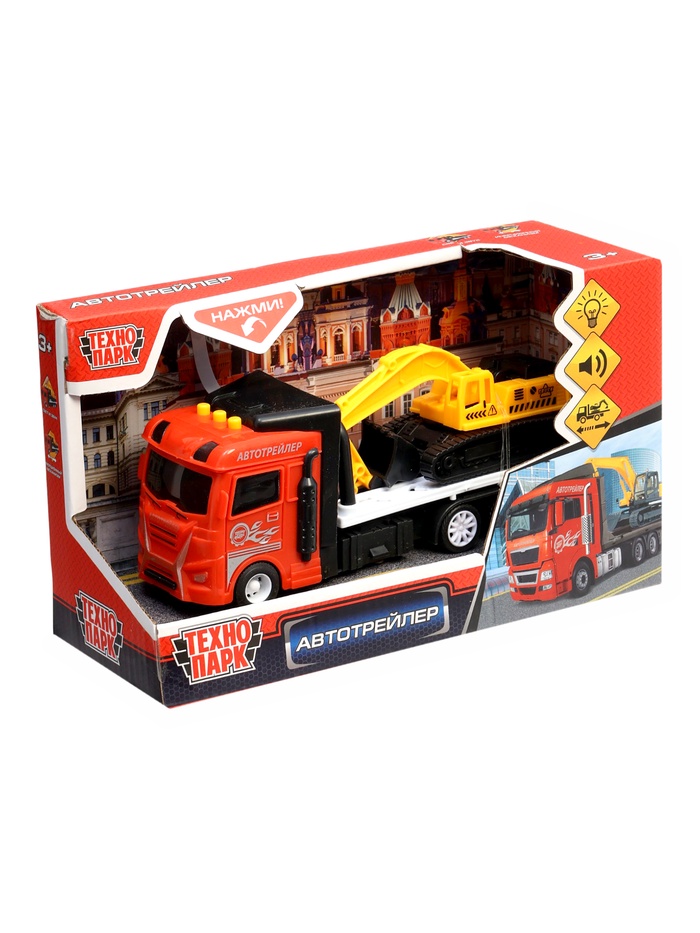 Этот автоперевозчик не просто едет — он работает! С помощью инерции он мчится вперёд, издаёт реалистичные звуки двигателя и мигает фарами. А в кузове — настоящий экскаватор, который можно выгрузить, поставить на колёса и использовать отдельно. Ребёнок создаёт собственную историю: доставил технику на стройку, начал рыть котлован, погрузил грунт и уехал обратно.