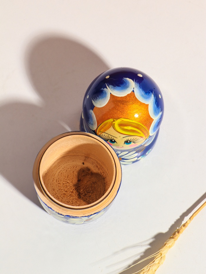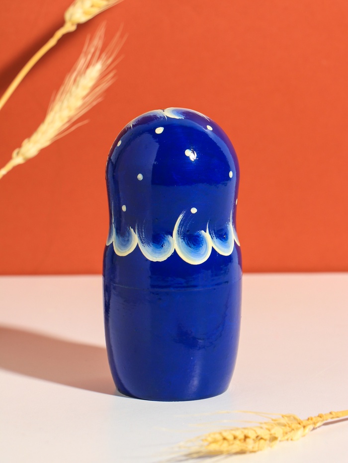 Технические характеристики Матрешка "Настёна", синее платье, белые цветы, 18 см,5 кукольная, ручная роспись