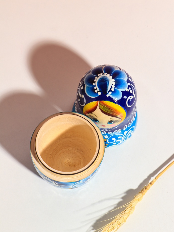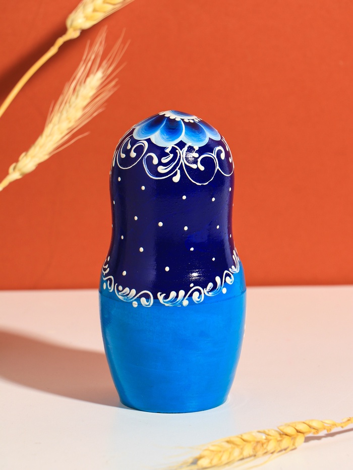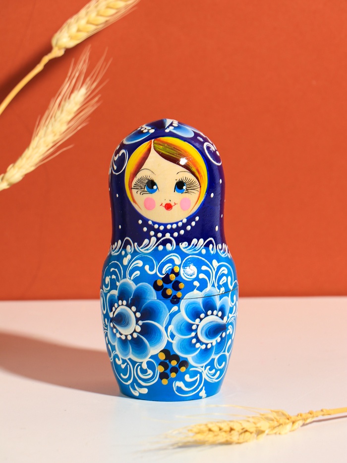 Технические характеристики Матрешка "Русская красота", синий платок, 18 см,5 кукольная, ручная роспись