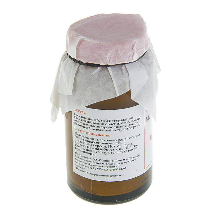 масляный экстракт лавра, череды, сафлора, плодов софоры, зверобоя, календулы, льна, чистотела, воск пчелиный, масло облепиховое, масло прополисное, масло виноградной косточки, масло репейное, дёготь берёзовый, мёд.