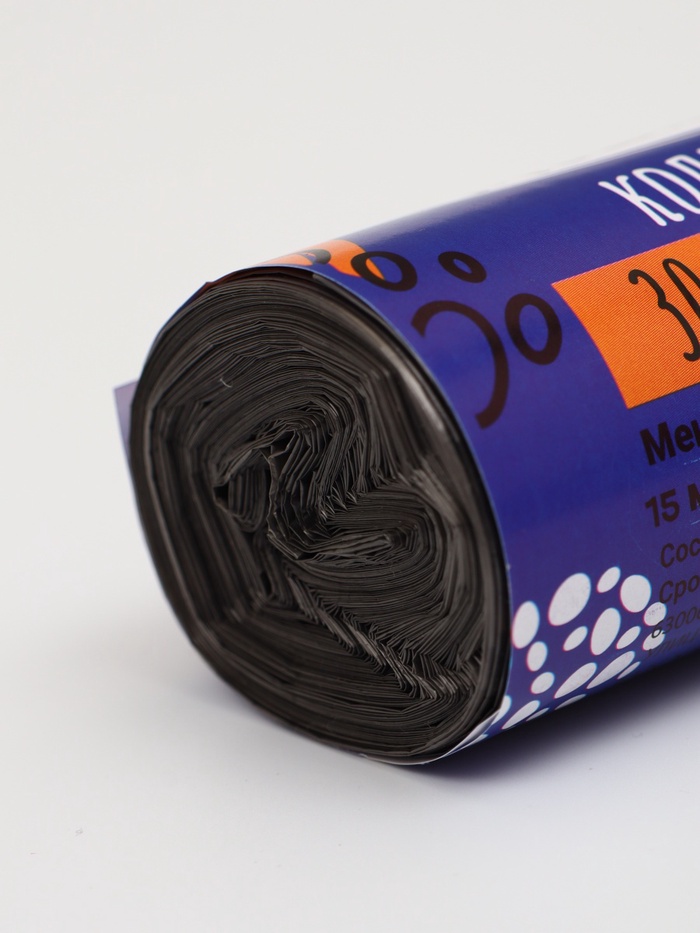 - Толщина 15 мкм: Экономичный вариант для повседневных отходов. Пакеты достаточно прочные для бумаги, упаковок, пищевых остатков, но при этом тонкие и не занимают много места в рулоне.