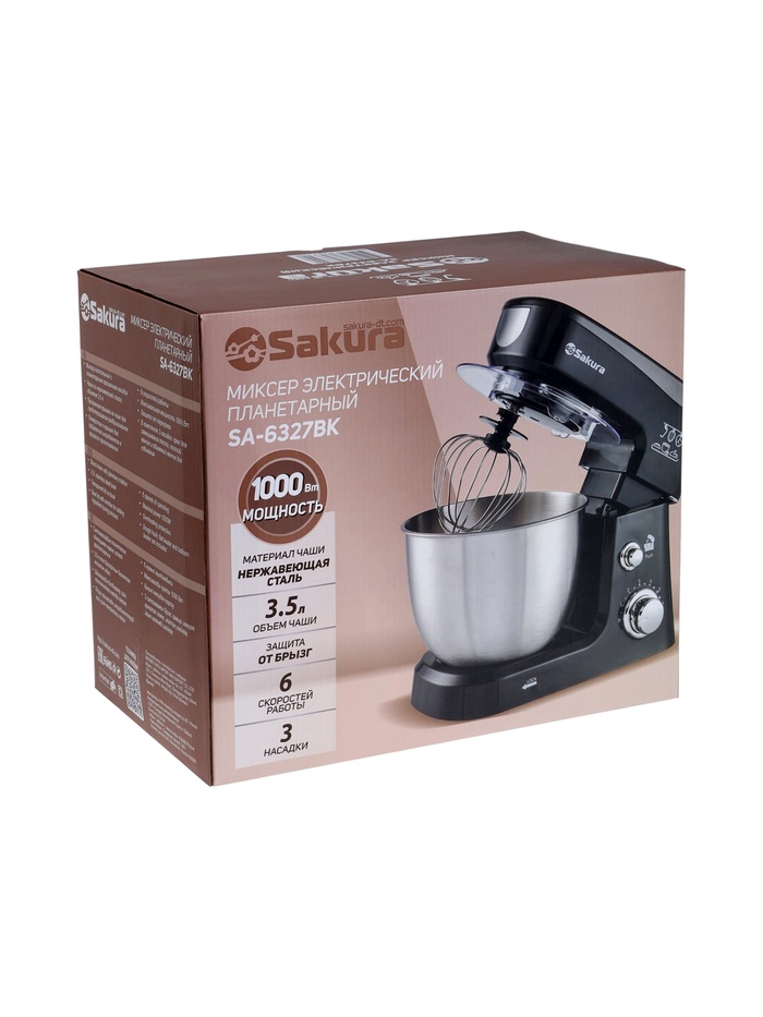 Миксер планетарный Sakura SA-6327BK, 1000 Вт, 6 скоростей, чаша 3.5 л, 3 насадки, чёрный