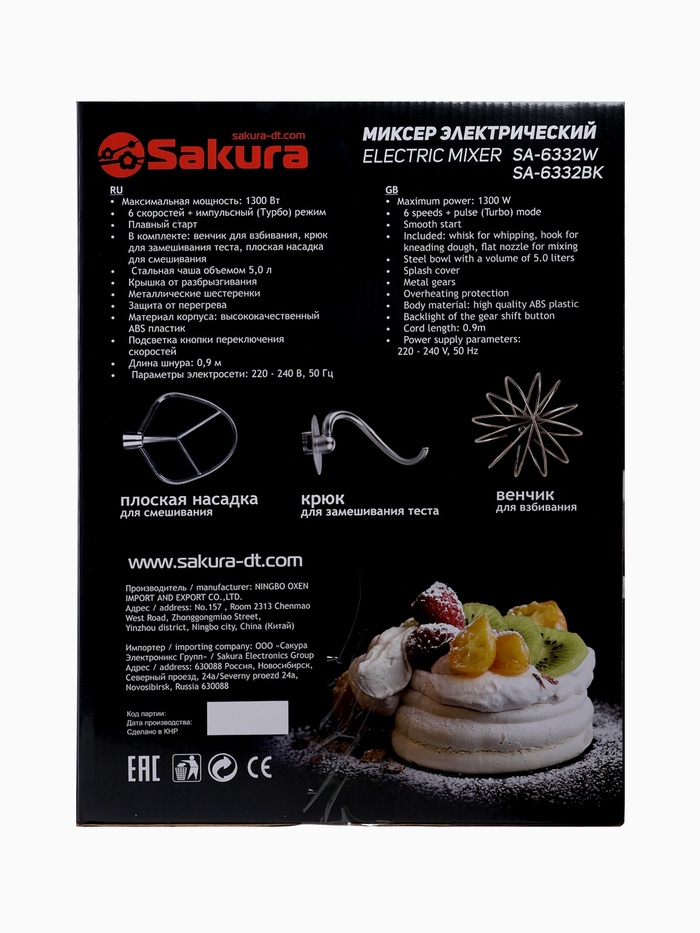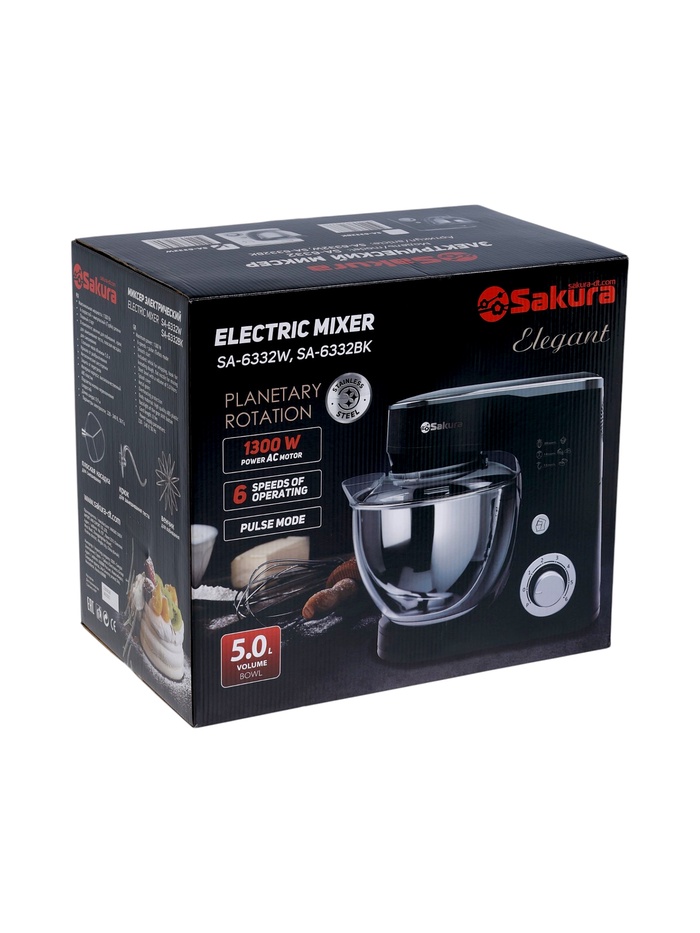 Миксер планетарный Sakura SA-6332W, 1300 Вт, 6 скоростей, чаша 5 л, 3 насадки, белый