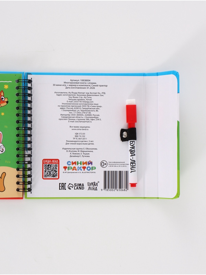 Технические характеристики Многоразовая книга с играми «Синий трактор», 30 мини-игр + маркер