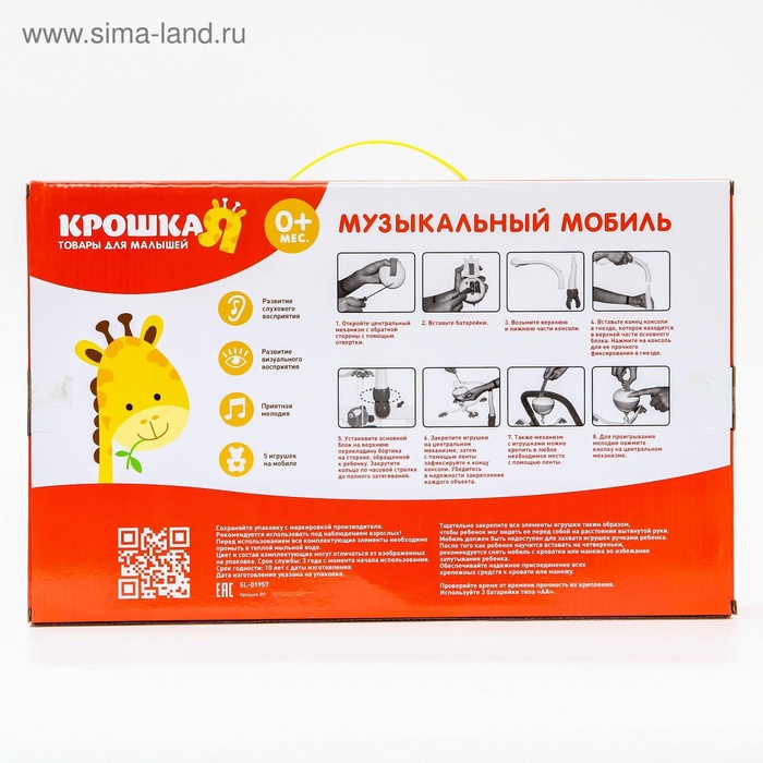 - Музыкальный блок работает от 3 батареек типа АА — мобиль проигрывает 8 мелодий и плавно вращается. Это успокаивает малыша и развивает зрительное восприятие.