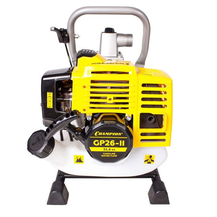 Бензиновая мотопомпа Champion GP26-II, мощность 1.2 л.с., производительность 130 л/мин, напор до 30 м, диаметр патрубков 25 мм — насос для перекачки чистой воды. Оснащена 2-тактным двигателем мощностью 1.2 л.с., объем двигателя 32.6 см³. Производительность 130 литров в минуту, максимальная высота подъема воды 30 метров. Патрубки диаметром 25 мм.