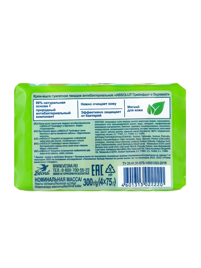 Технические характеристики МТ "ABSOLUT FitoGuard " грейпфрут и бергамот , 4*75 г