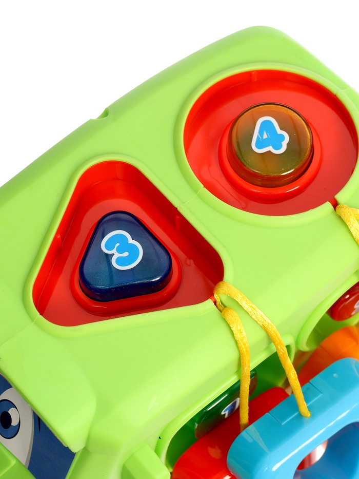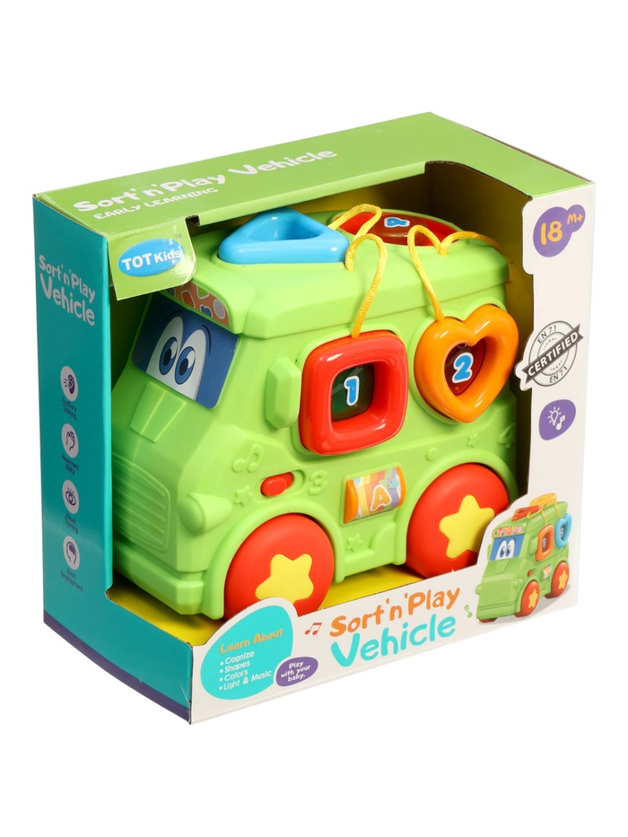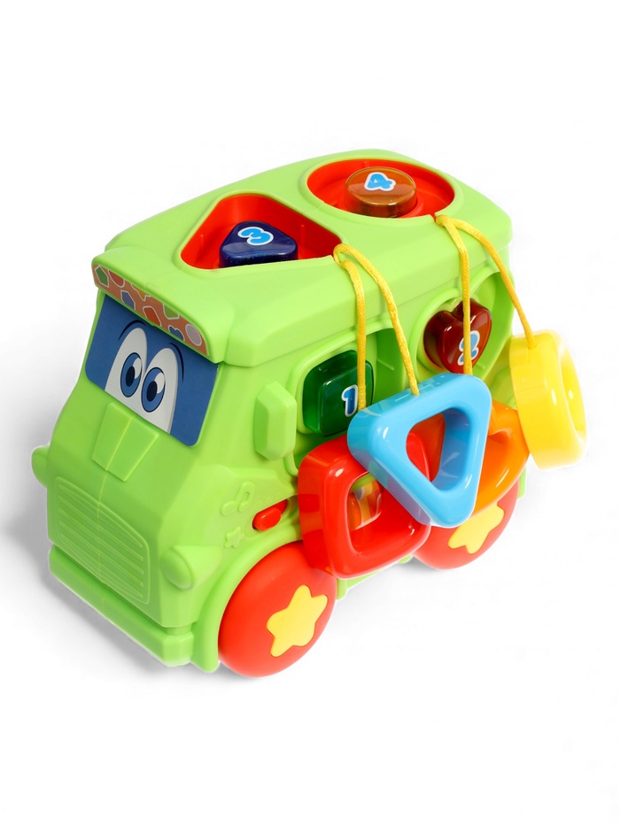 Музыкальная игрушка «Автобус» — это яркая обучающая машинка, которая развлекает малыша и помогает развивать полезные навыки. На бортах расположены крупные кнопки с цифрами и подсветкой, сбоку — геометрические сортеры на шнурках, а сверху — съёмные фигурки для вставления по форме. Игрушка звучит, светится и реагирует на действия ребёнка, превращая знакомство с цифрами, цветами и формами в увлекательную игру.