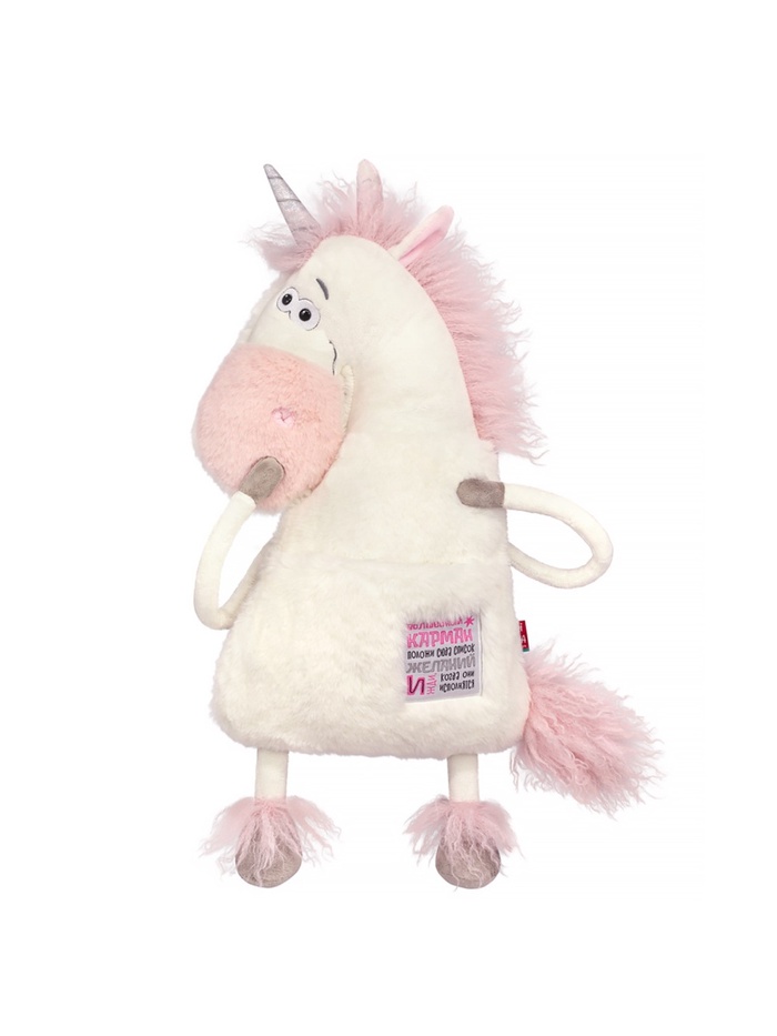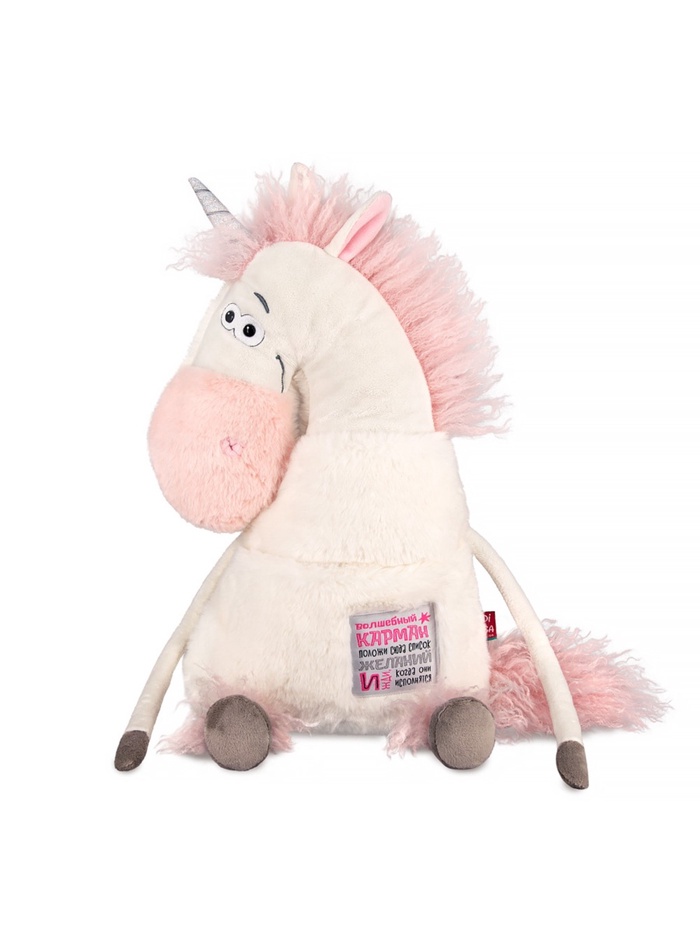 - Игрушка выполнена в виде необычного коня-единорога с мягким молочным мехом, розовой мордочкой и гривой, что добавляет ей особого очарования.