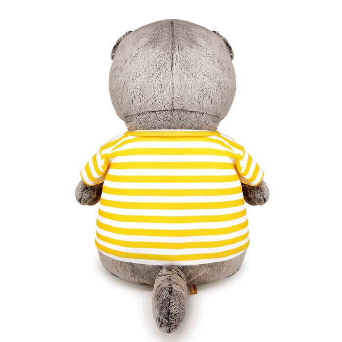 Мягкая игрушка «Кот Басик в футболке „Гусик в маске для плавания“» — яркий и забавный герой, который заряжает позитивом. В жёлто-белой футболке с принтом и оранжевым бантом Басик выглядит по-летнему стильно и добавляет хорошего настроения в любой день.