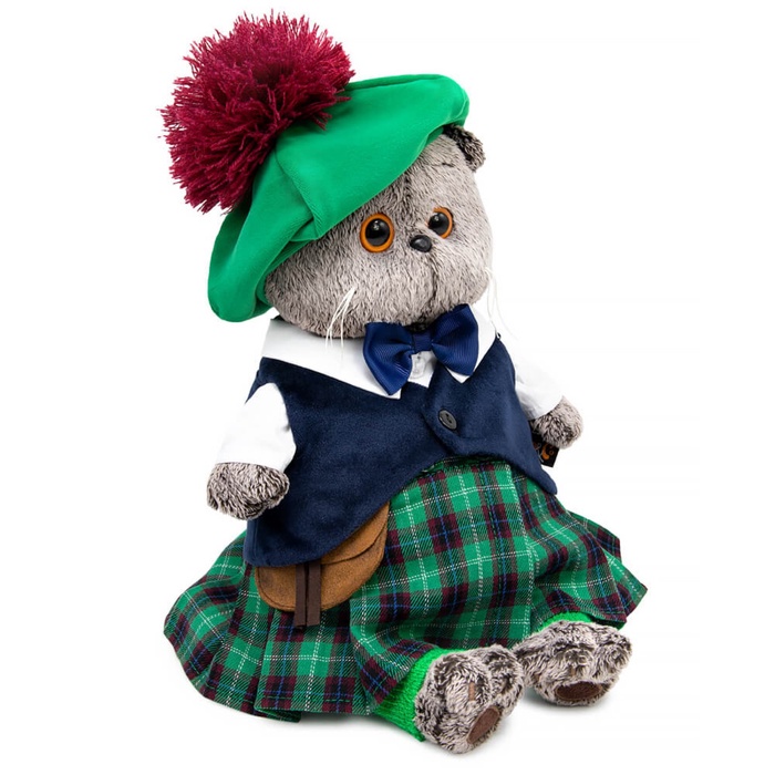 Мягкая игрушка «Басик в шотландском костюме» — уютный коллекционный кот, одетый в традиционный шотландский образ. Килт в клетку, жилет, рубашка, берет с помпоном и аккуратная бабочка создают яркий и запоминающийся стиль, который делает игрушку отличным подарком и украшением интерьера.