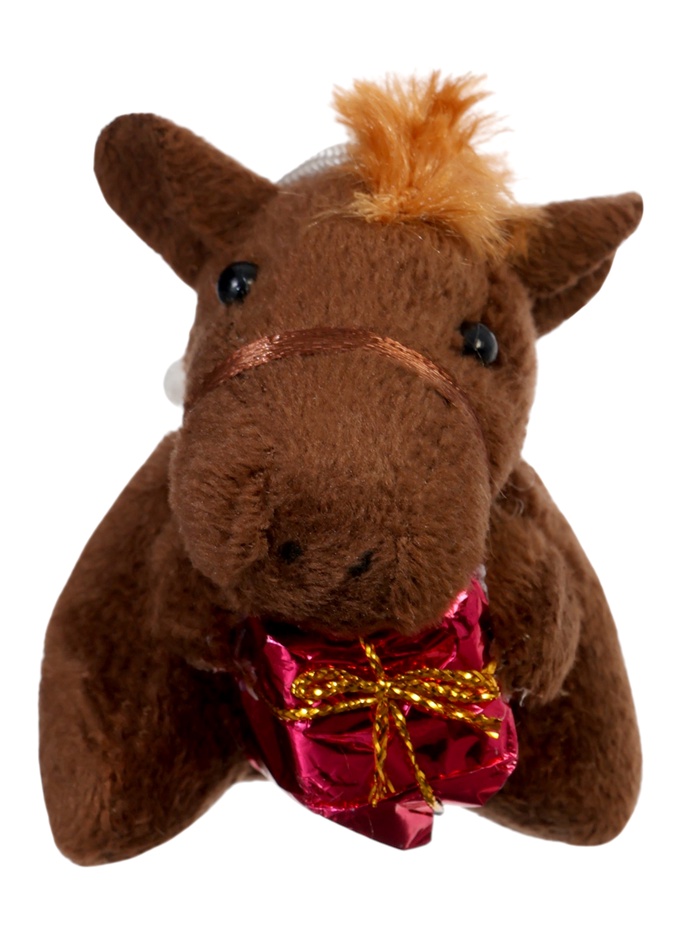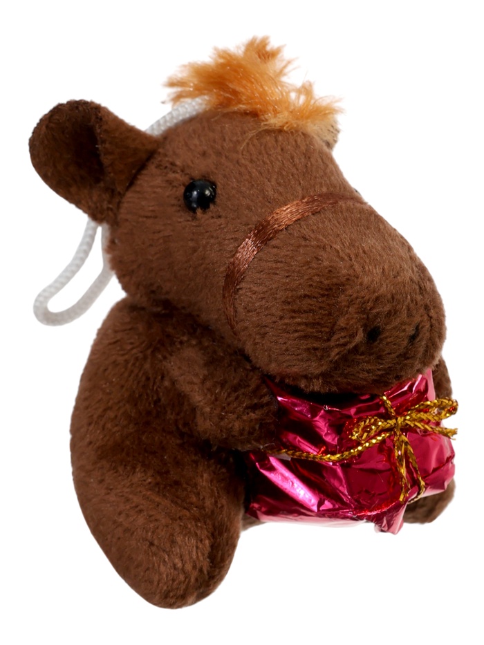 Милая лошадка с блестящим подарком — маленькая игрушка, которая сразу привлекает внимание. У неё мягкая плюшевая шерстка, выразительные глазки и забавная гривка, а подарок в лапках делает образ по-настоящему праздничным. Такая лошадка легко поднимает настроение и становится приятным маленьким дополнением к любому событию.