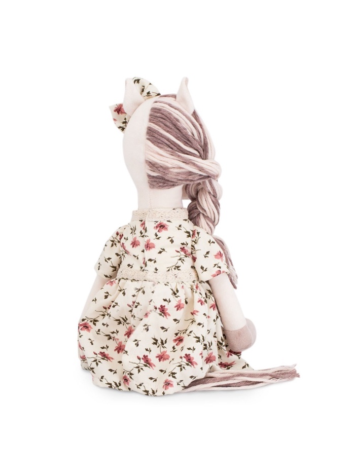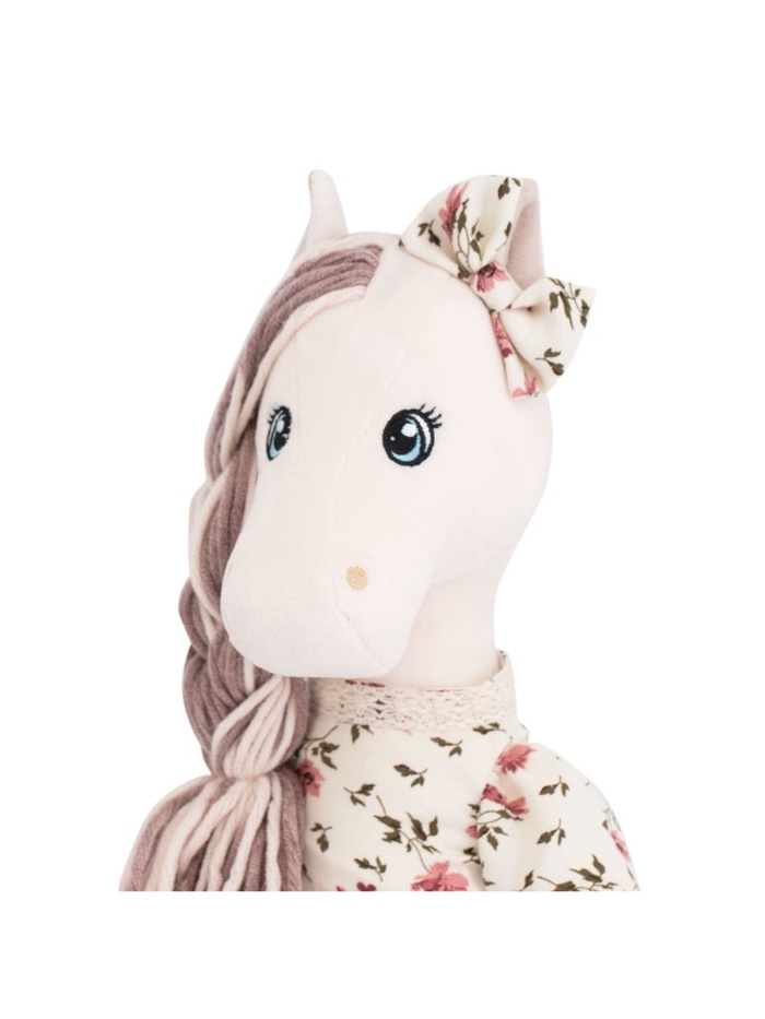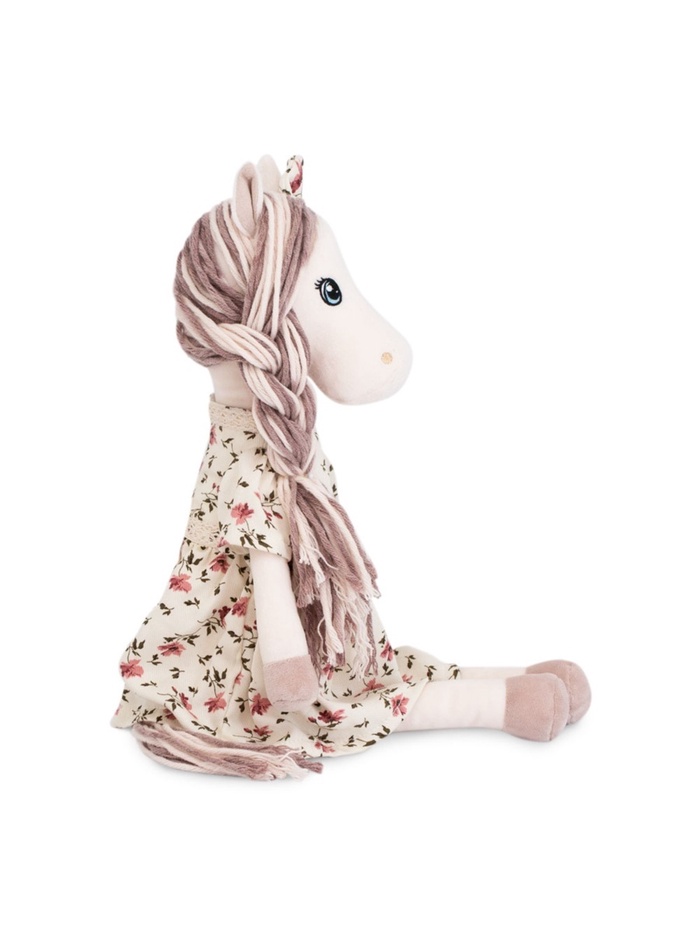 - Игрушка выполнена в виде милой лошадки с мягкой текстурой и стильной одеждой: пышное цветочное платье добавляет ей особого очарования.