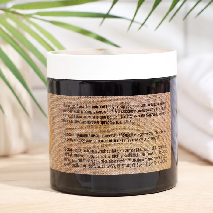 Мыло для бани Harmony of body изготовлено с применением натуральных растительных экстрактов эфирных масел. Может использоваться как гель для душа или шампунь для волос. Для получения максимального эффекта рекомендуются использовать в бане.