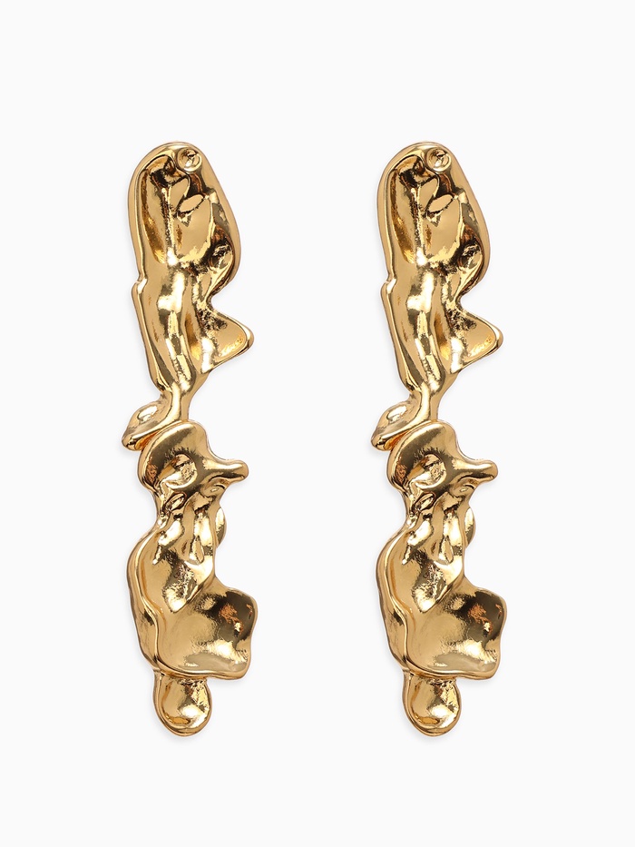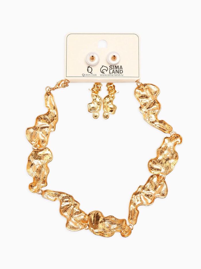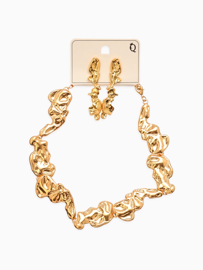 Посмотрите с нового угла на классические украшения с необычным набором «Мятое». Здесь мы видим две детали, объединяющие изящество и минимализм, представленные элегантными золотыми серьгами и колье, созданными специально для современного городского ритма.
