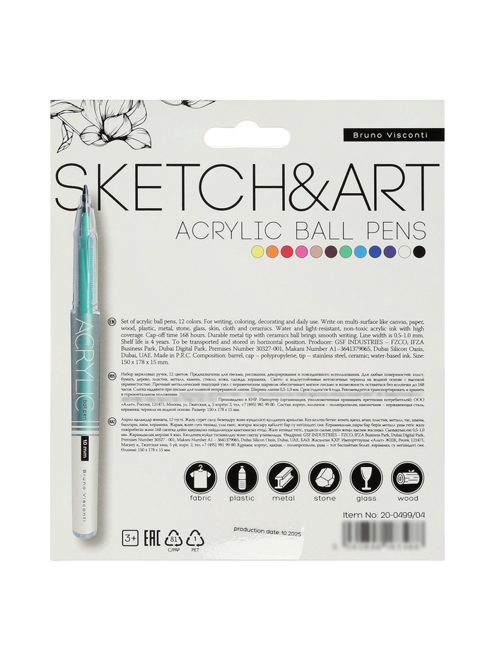 Набор акриловых ручек — универсальный инструмент для письма, рисования и декоративных работ. В комплект входит 12 ярких цветов, что позволяет создавать выразительные рисунки, оформлять записи и реализовывать творческие идеи. Толщина линии 1.0 мм обеспечивает чёткое и аккуратное нанесение, а акриловые чернила дают насыщенный и плотный цвет.