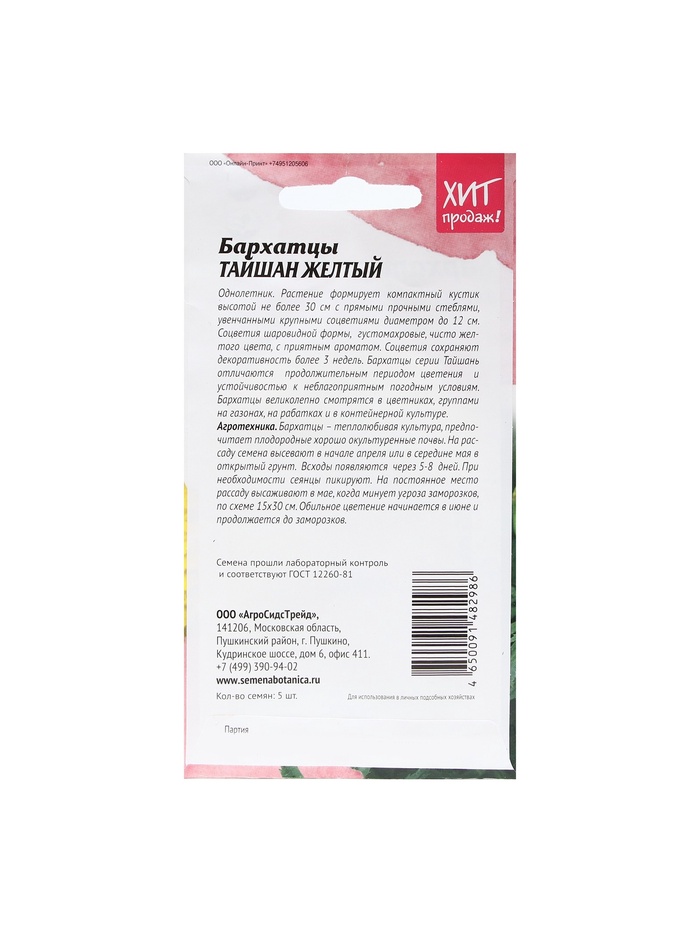 Технические характеристики Набор семян Бархатцы "Тайшань желтый", 5 шт.