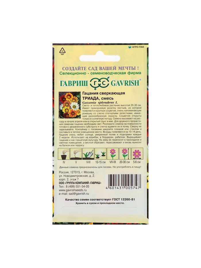 Технические характеристики Набор семян Гацания крупноцветковая "Триада", смесь, О, 5 шт.