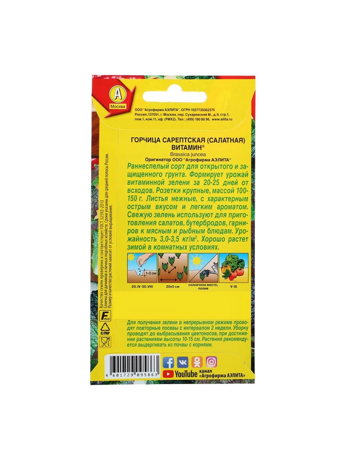 Технические характеристики Набор семян Горчица салатная "Витамин", 5 шт.