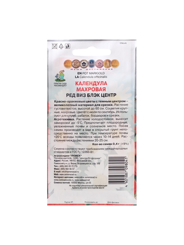 Технические характеристики Набор семян Календула махровая "Ред виз блэк центр", 5 шт.