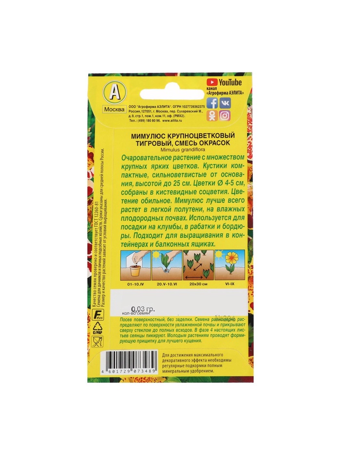 Технические характеристики Набор семян Мимулюс "Крупноцветковый тигровый", смесь окрасок, О, 5 шт.