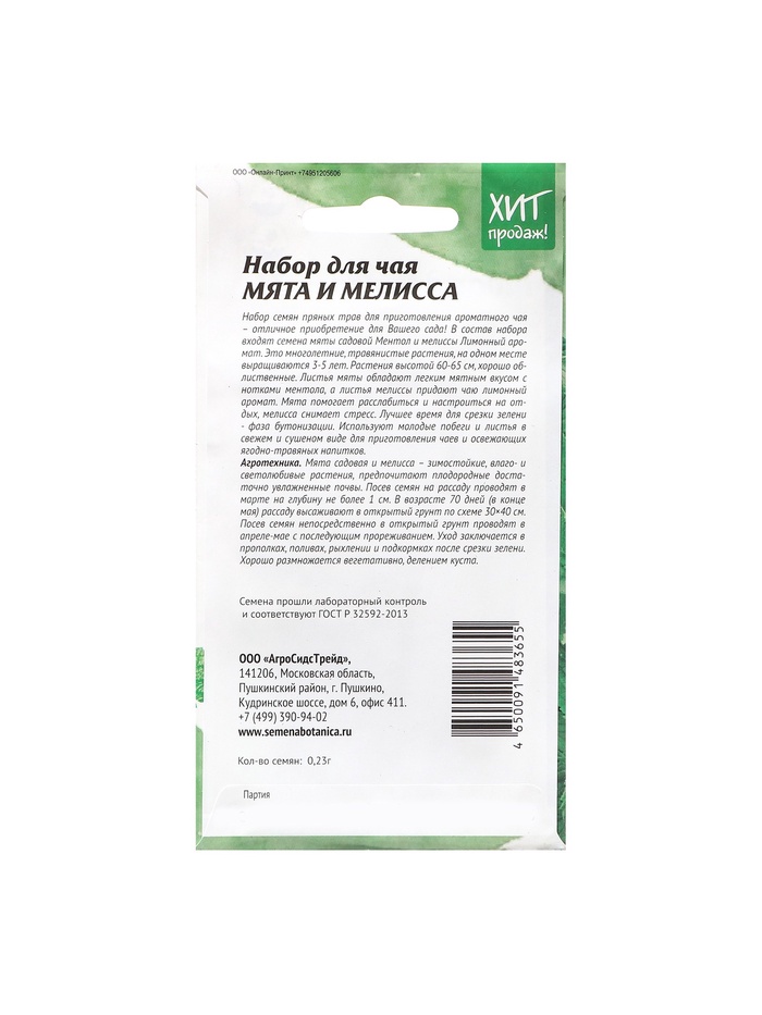 Технические характеристики Набор семян Мята и мелисса "Набор для чая", 5 шт.