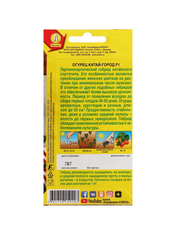 Технические характеристики Набор семян Огурец "Китай-город", F1, , 5 шт.