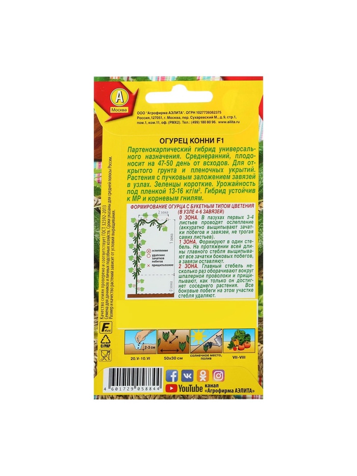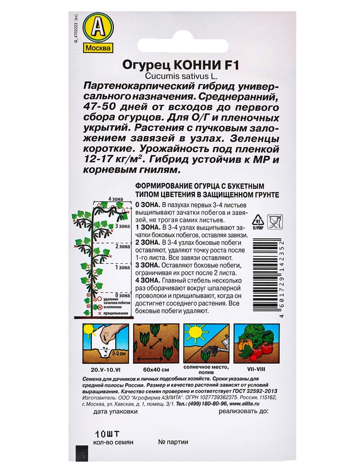 Технические характеристики Набор семян Огурец "Конни" F1, среднеранний, партенокарпический, 5 шт.