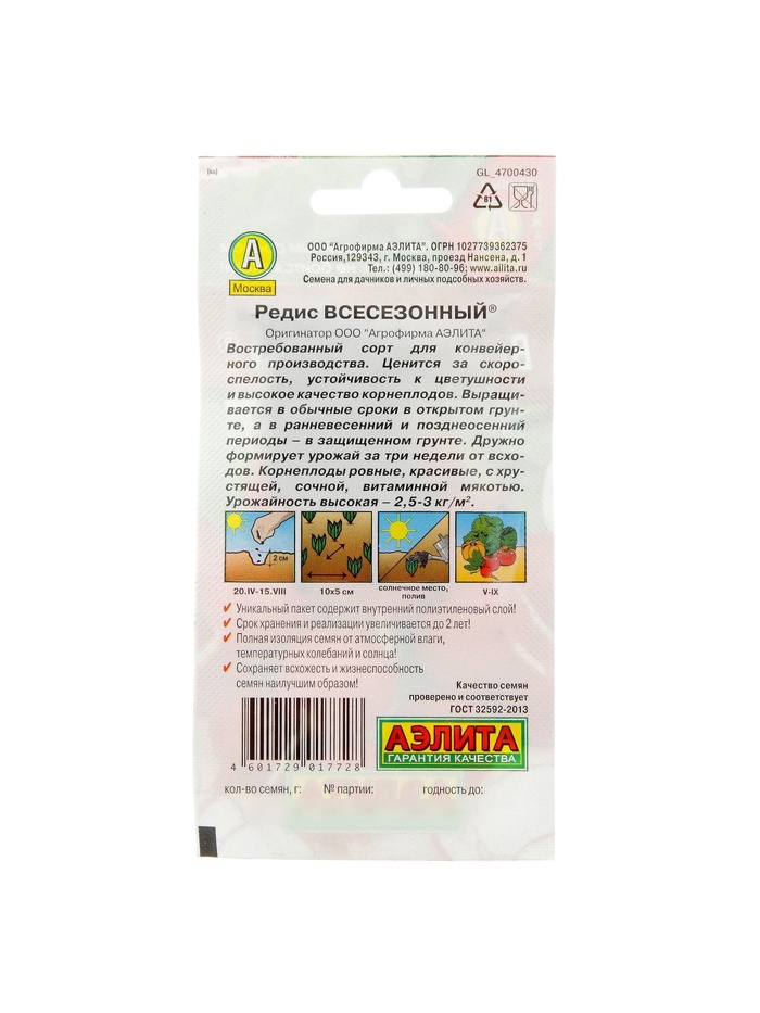 Технические характеристики Набор семян Редис "Всесезонный", 2 гр., 5 шт.