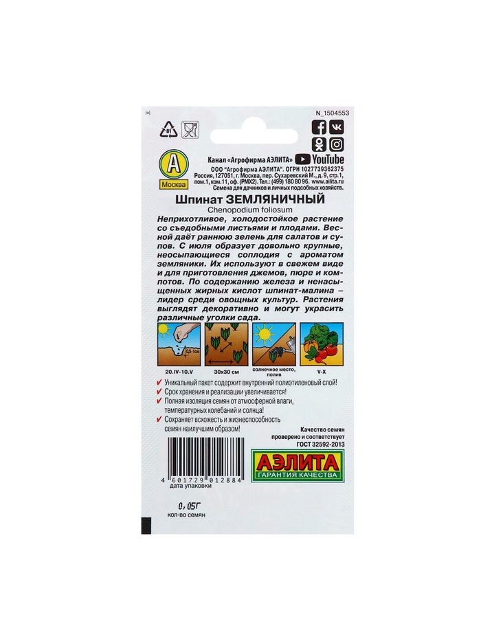 Технические характеристики Набор семян Шпинат "Земляничный", 5 шт.