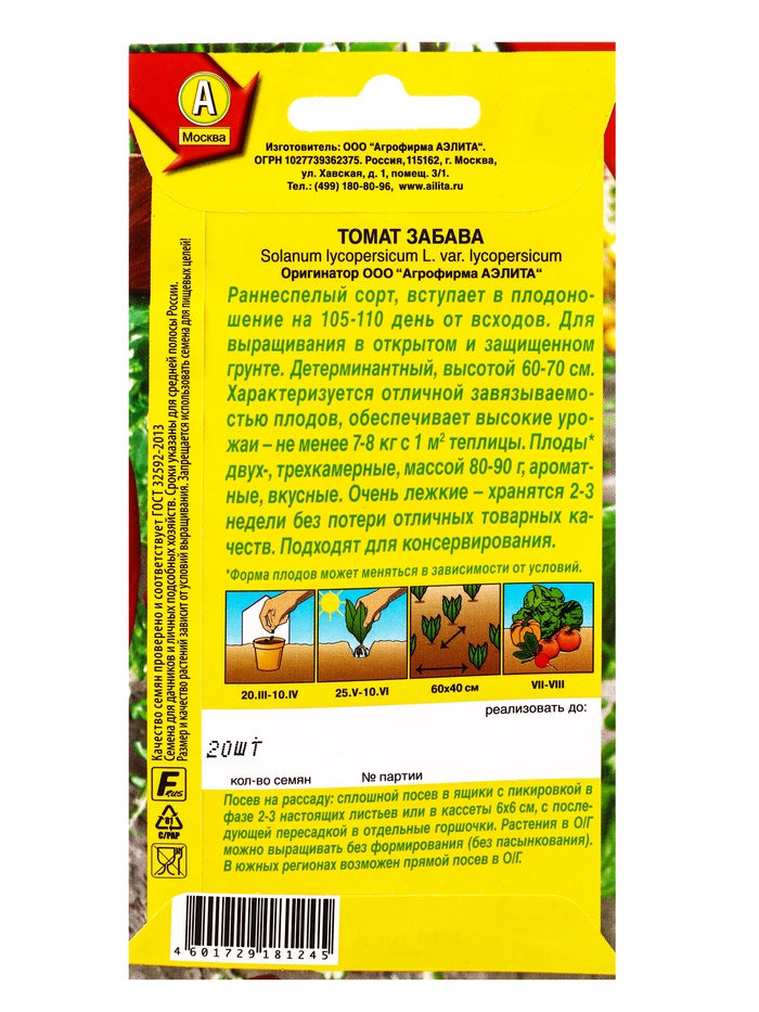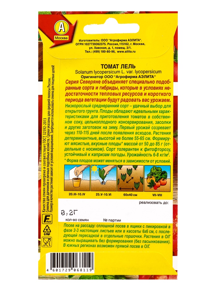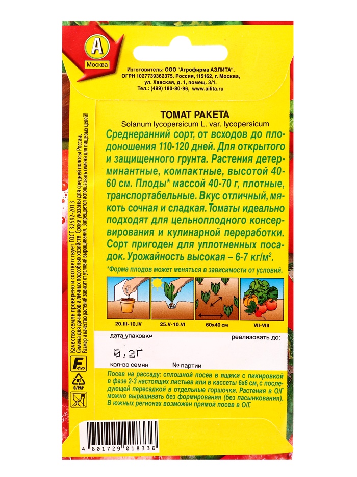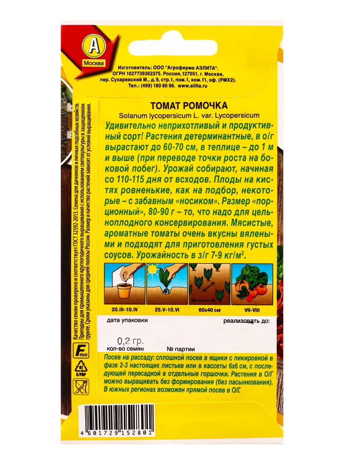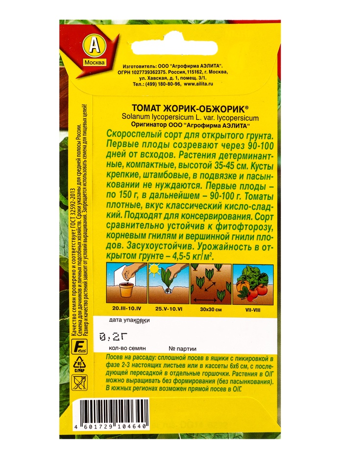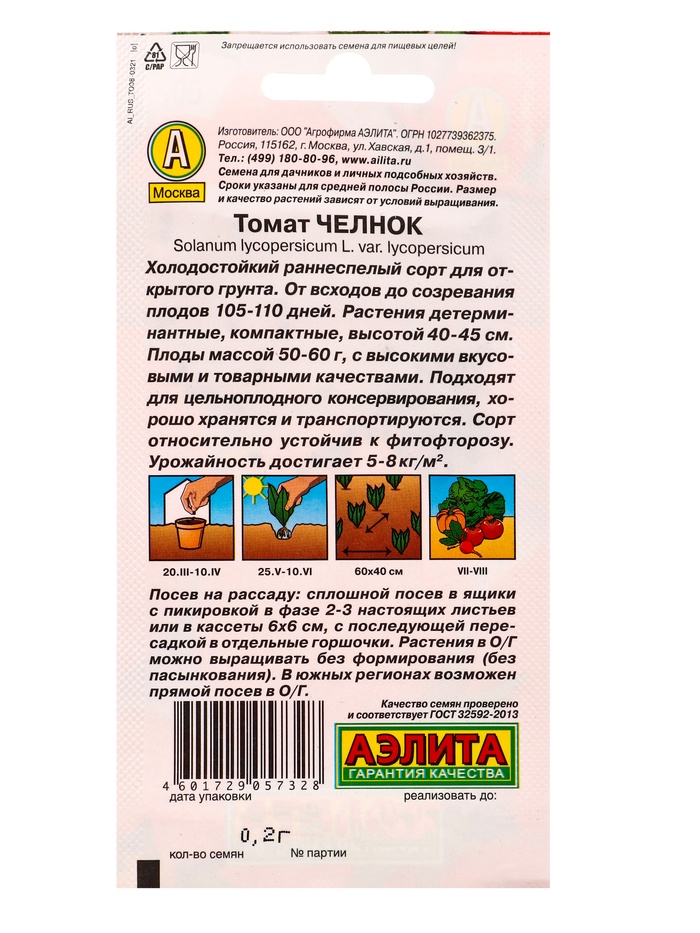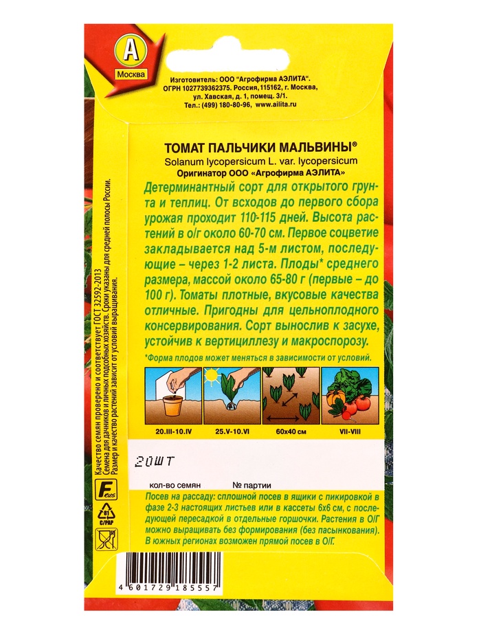 Технические характеристики Набор семян Томат, низкорослый для открытого грунта и теплиц