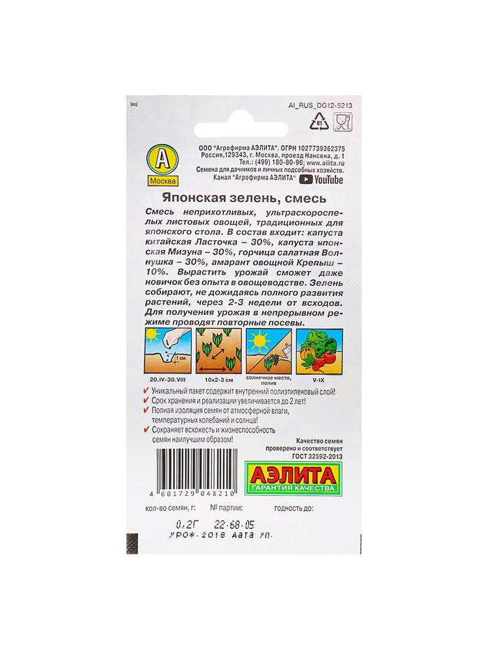 Технические характеристики Набор семян Японская зелень, смесь, 5 шт.