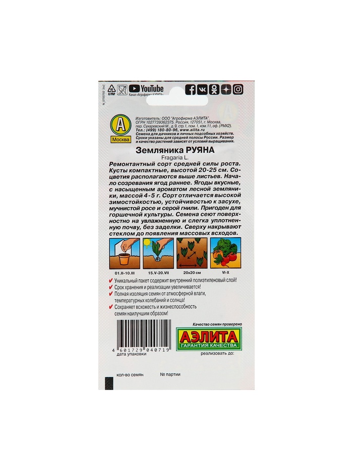 Технические характеристики Набор семян Земляника "Руяна" альпийская, 5 шт.