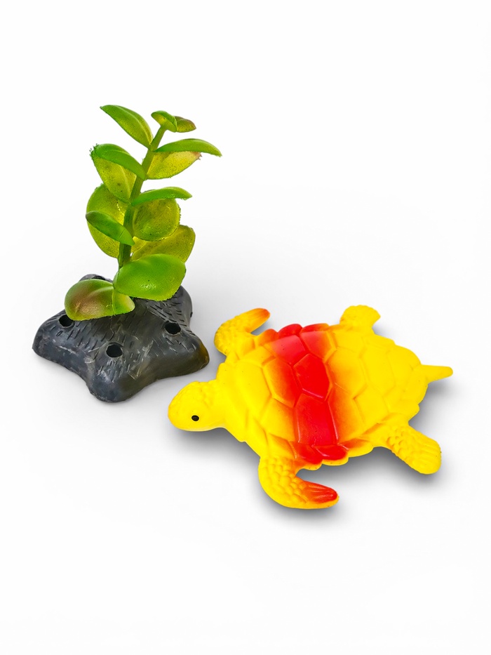 Декор из мягкой резины – это безопасное и яркое украшение для вашего домашнего водоема. Комплект сочетает фигурку черепахи и зеленые заросли, создавая живую композицию без лишнего ухода.