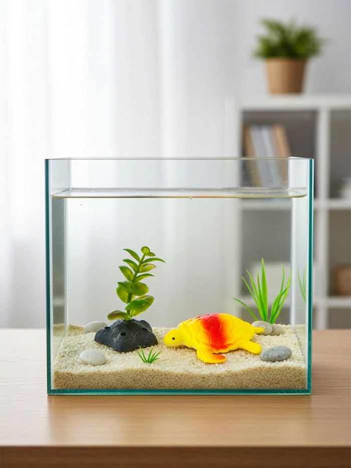 - Естественные укрытия: фигурка черепахи и трава образуют декорацию, где мелкие рыбы могут прятаться от соседей или отдыхать.