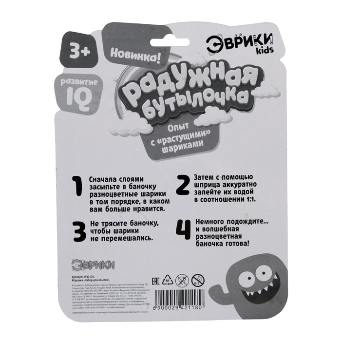 С набором торговой марки «Эврики» малыш проведёт свои первые опыты, изготовит радужную бутылочку и поэкспериментирует с растущими шариками.