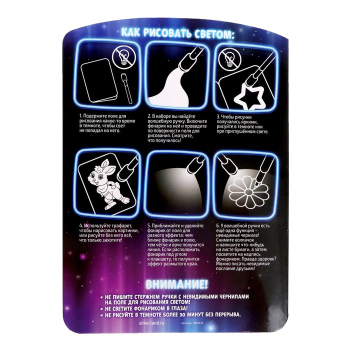С помощью набора для рисования светом ребёнок освоит новый вид творчества. Всё, что пригодится для этого, уже есть в комплекте: поле для рисования, трафареты, специальная ручка и фонарик.
