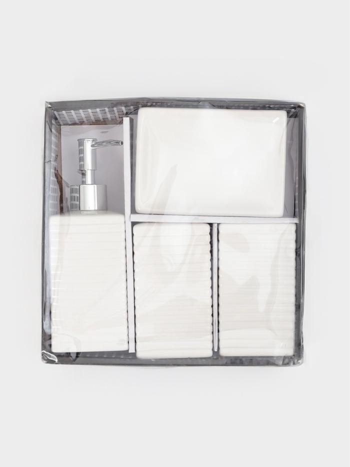 - Полный комплект: Четыре предмета закрывают все базовые потребности: жидкое мыло под рукой, стаканы для щёток и мыльница для кускового мыла.