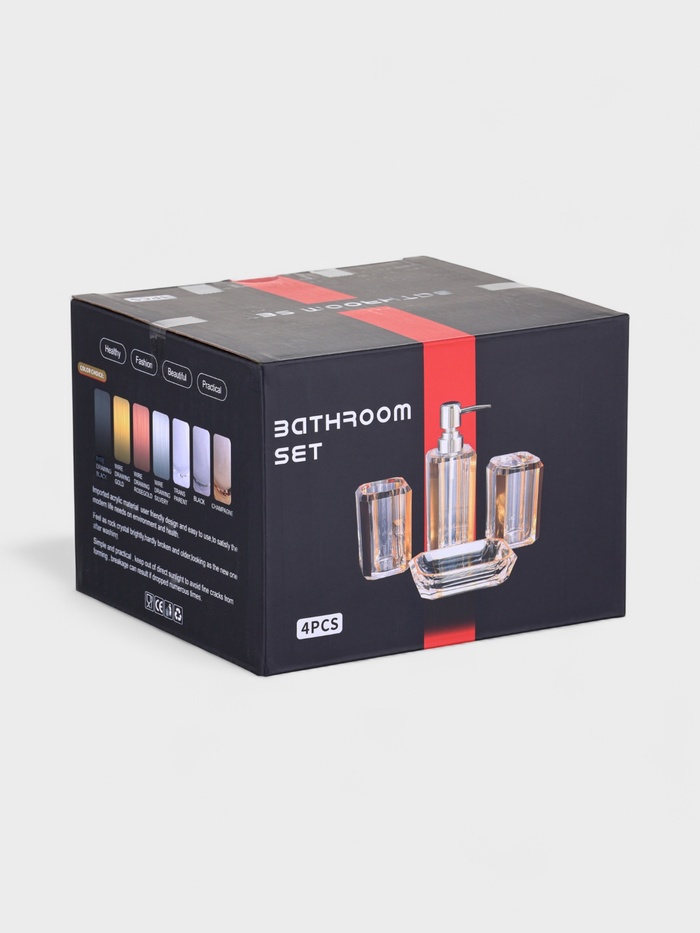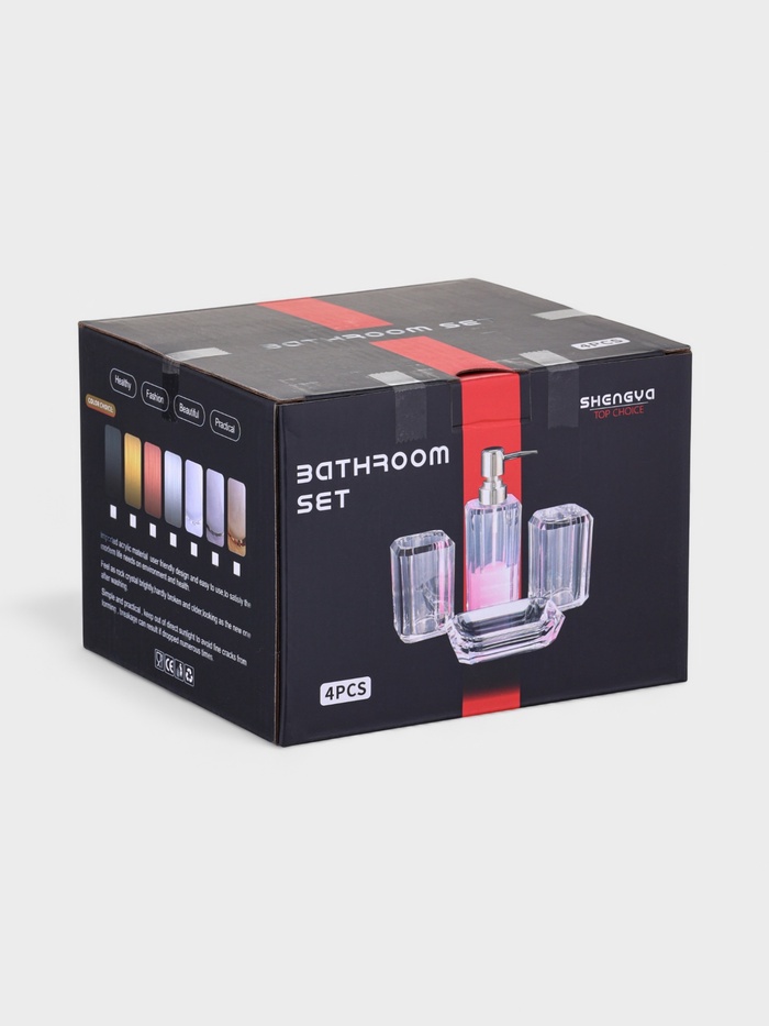 - Комплект из 4 предметов: дозатор для жидкого мыла, мыльница и два стакана для зубных щёток или бритв.