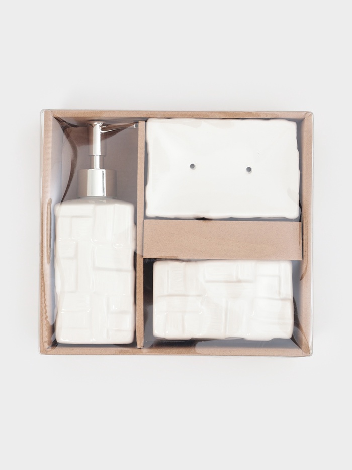 Небольшой ванной комнате часто не хватает не просто порядка, а визуальной тишины. Этот комплект из трёх предметов решает обе задачи. Белая керамика с фактурой плетения создаёт спокойный, тактильно выразительный ансамбль. Здесь нет ничего лишнего — только дозатор, стакан и мыльница, которые занимают ровно столько места, сколько нужно, и не перегружают пространство.