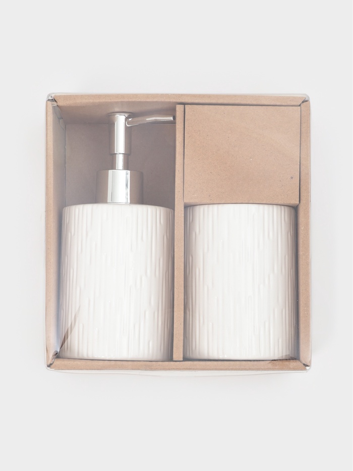 В этом наборе нет ничего лишнего. Форма предметов продиктована исключительно функцией: дозатор с широким основанием не требует точного нажатия по центру, стакан с утяжелённым дном не падает, даже если задеть его локтем. Глазурованная поверхность легко моется, на ней не задерживается мыльный налёт. Помпа дозирует средство экономно и не подтекает. Это решение для тех, кто считает, что лучший декор в ванной — это чистота и тишина.